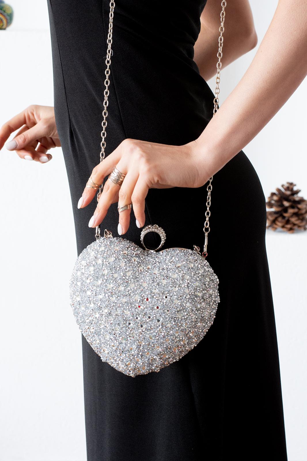İmpolo Ella Kalp Taşlı Gümüş Kadın Abiye El Çanta 19×20 Ebat