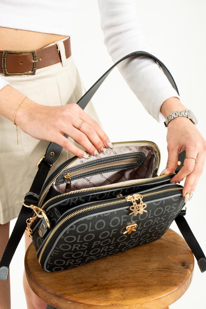 ImPolo Lili Siyah Gri Empirme Baskı Üç gözlü Kadın Omuz Çantası 17x28 Ebatında quantity