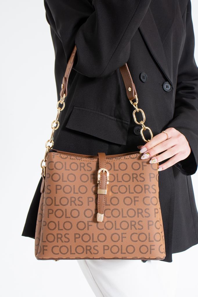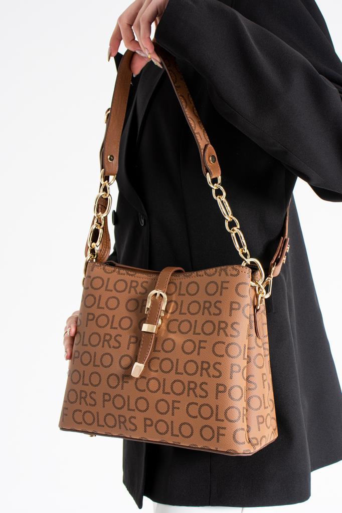İmpolo Marin Kahve Taba Empirme Baskı Kadın Omuz Çantası 22×25 Ebatında
